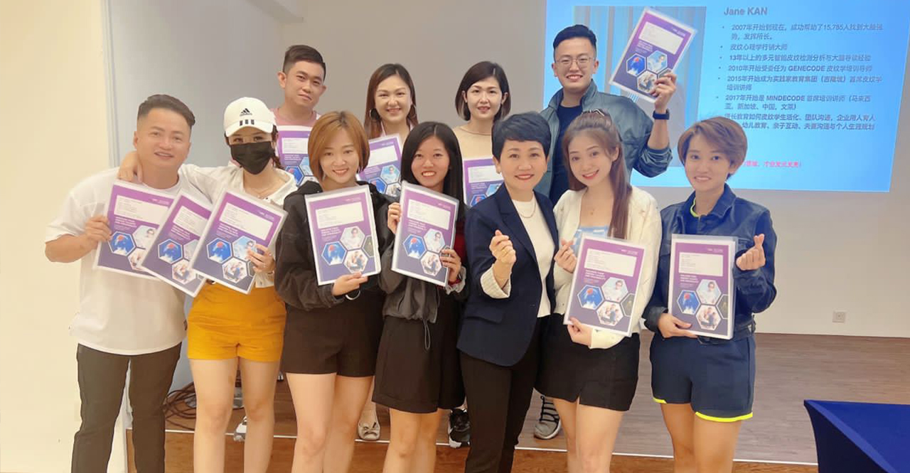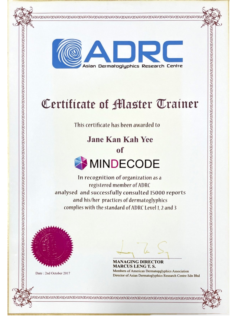从2017年开始,连续6年,Jane Kan 被任命为 MINDECODE Global (马来西亚、新加坡、中国、文莱) 的首席培训师,一年内进行超过19场的皮纹分析课程,并培训超过25位专业皮纹分析师。