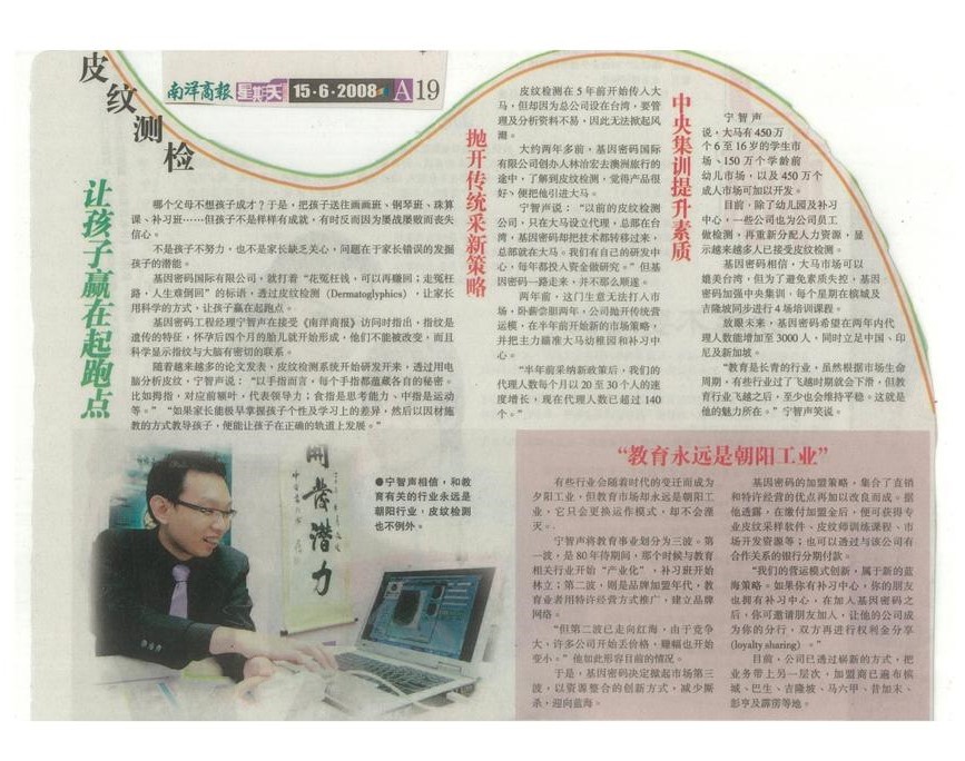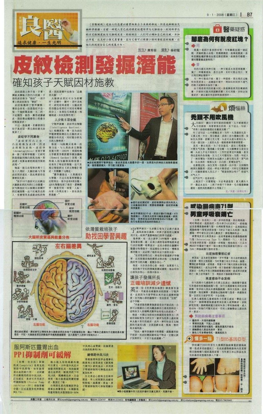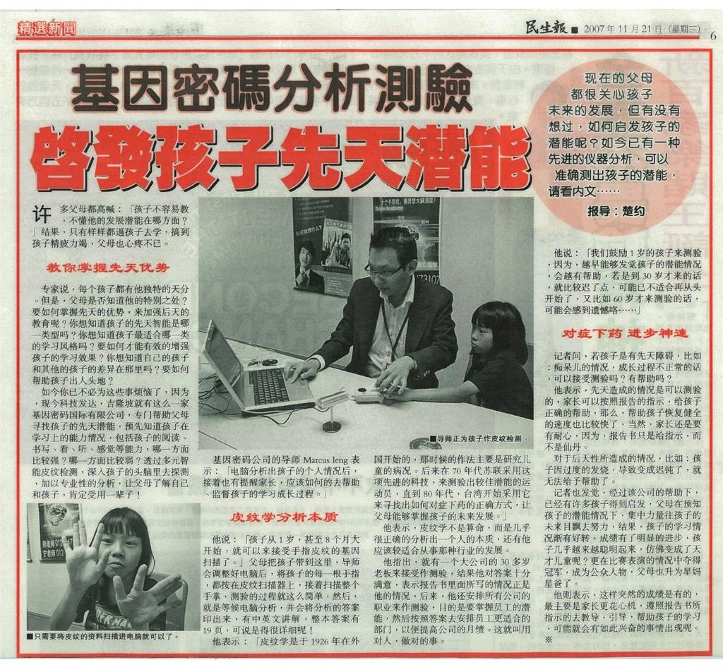 最新独家科技 - 通过分析每个孩子的大脑潜能皮纹,帮助每个家长发掘孩子们的学习优势,并释放潜在天赋。借助科学的力量,培育孩子们的专长,提升个人竞争力,开通社交技能,掌握无限可能的未来。